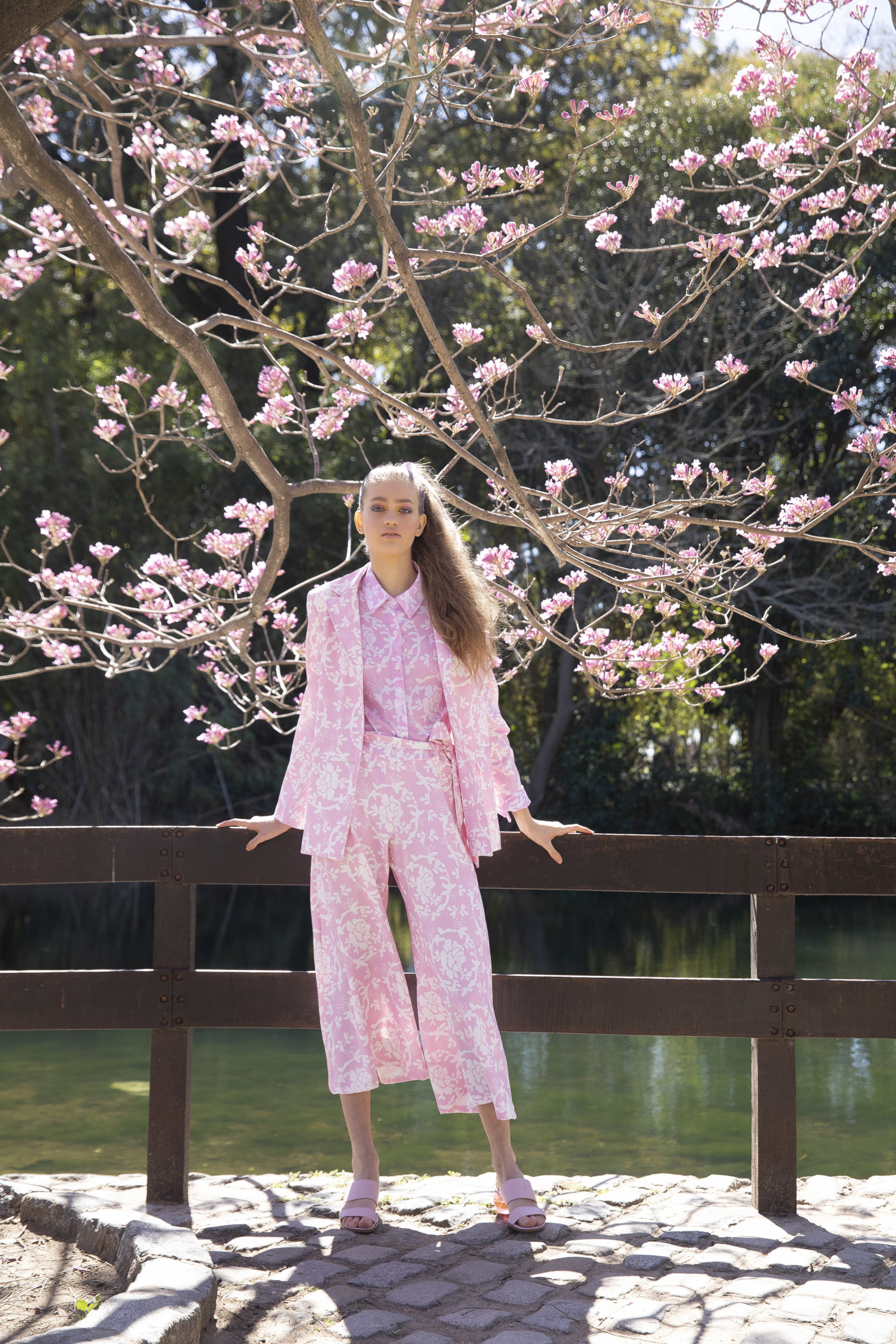 Escote en V y nudo + falda middy asimétrica con tablones y lazo. Todo en 50% algodón estampado y 50% lino.