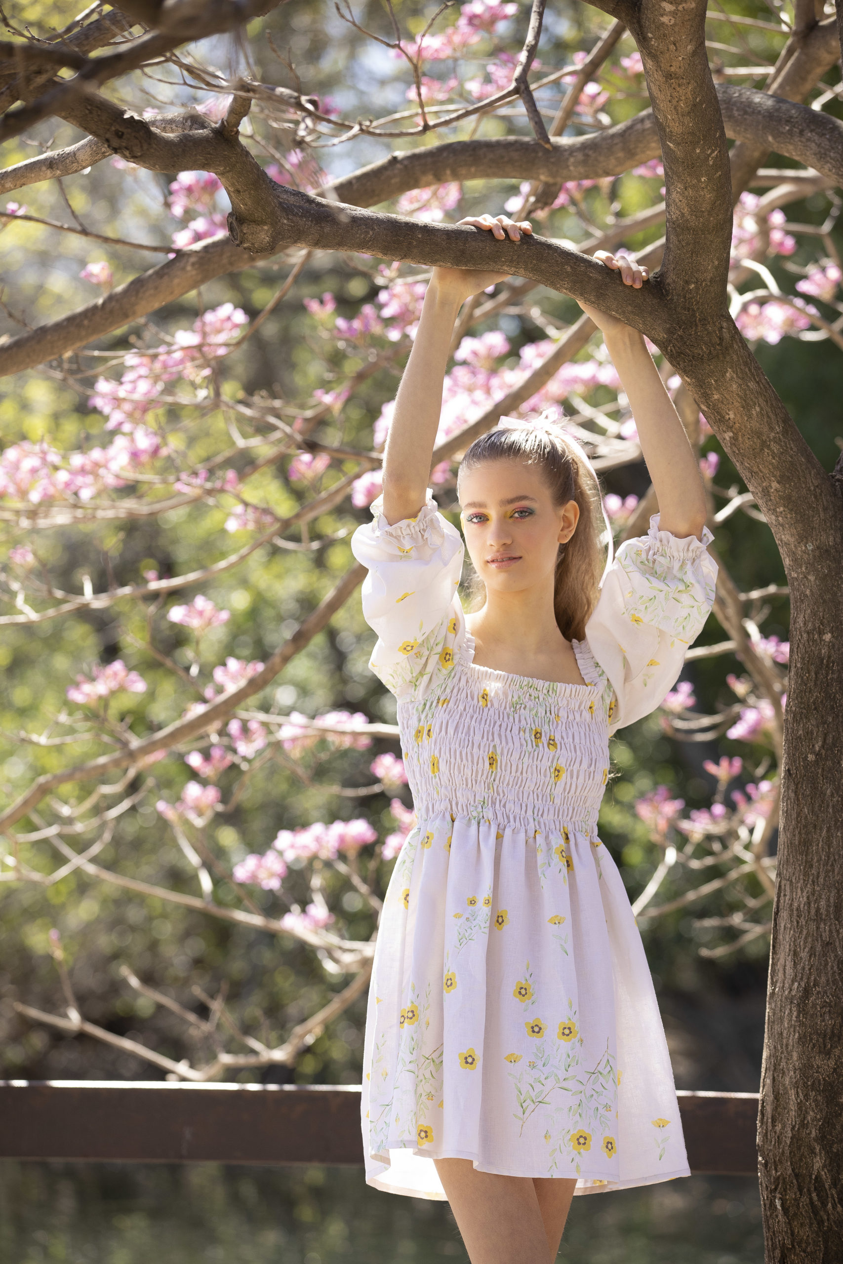 En algodón con corte en cintura. Falda fruncida y áreteles con lazos en poplin blanco.